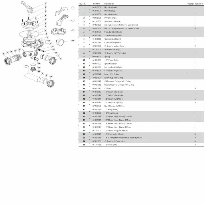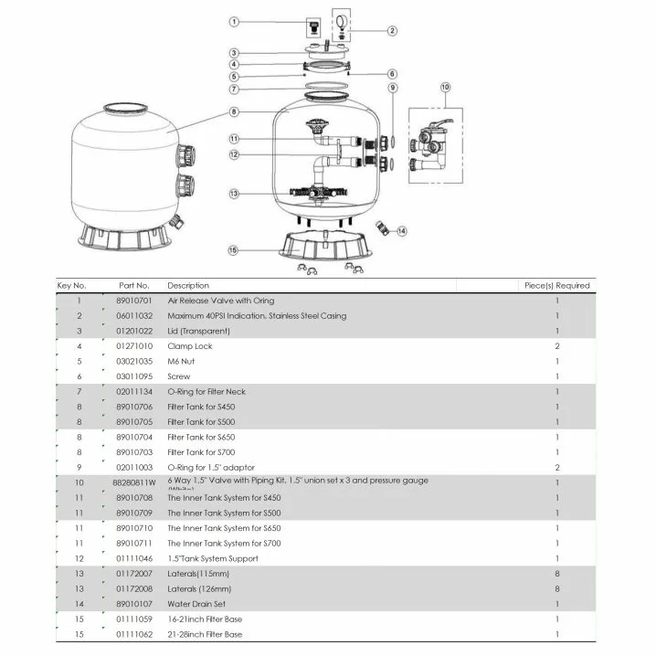 У комплекті: 6-режимний кран, муфти, манометр. Продуктивність – 19.5 м³/год. Діаметр підключення: 1.5" (50 мм). Захист від УФ-випромінювання дозволяє використовувати фільтр під сонцем.